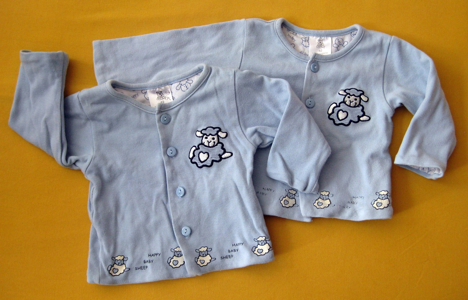 zwei ganz süße Jäckchen aus Baumwollstoff mit Schäfchen: eins aufgenäht, vier we...