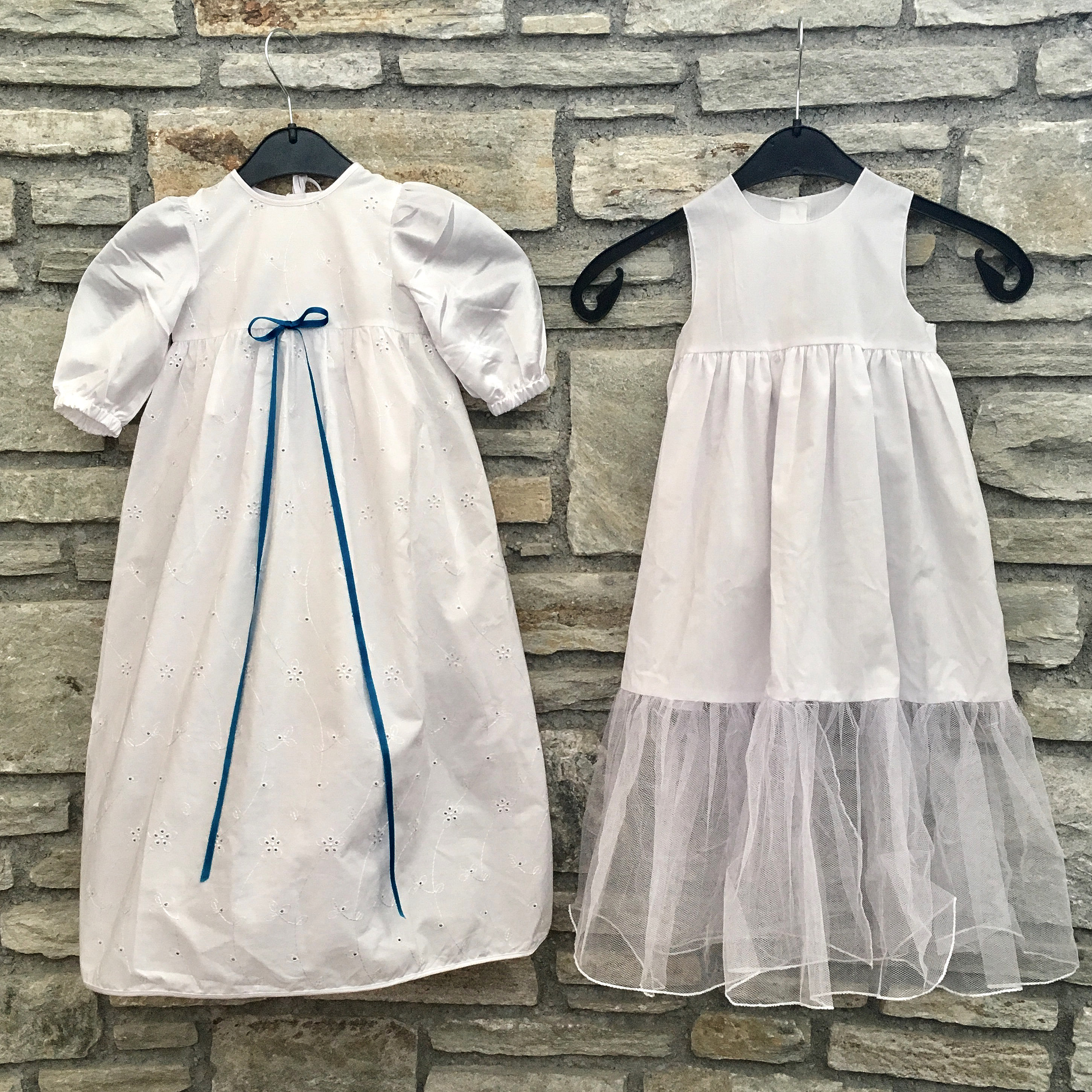 Die Taufkleider sind schlicht und doch elegant mit einer dezenten Stickerei verziert, die Ärmeln bestehen aus leicht glänzendem Satinstoff. Der passende Unterrock gehört dazu. Der weite und bequeme Schnitt erlaubt ein leichtes An- und Ausziehen. Wir haben die Taufkleider mit drei kleinen Schleifen individualisiert, diese können rückstandslos wieder entfernt werden.