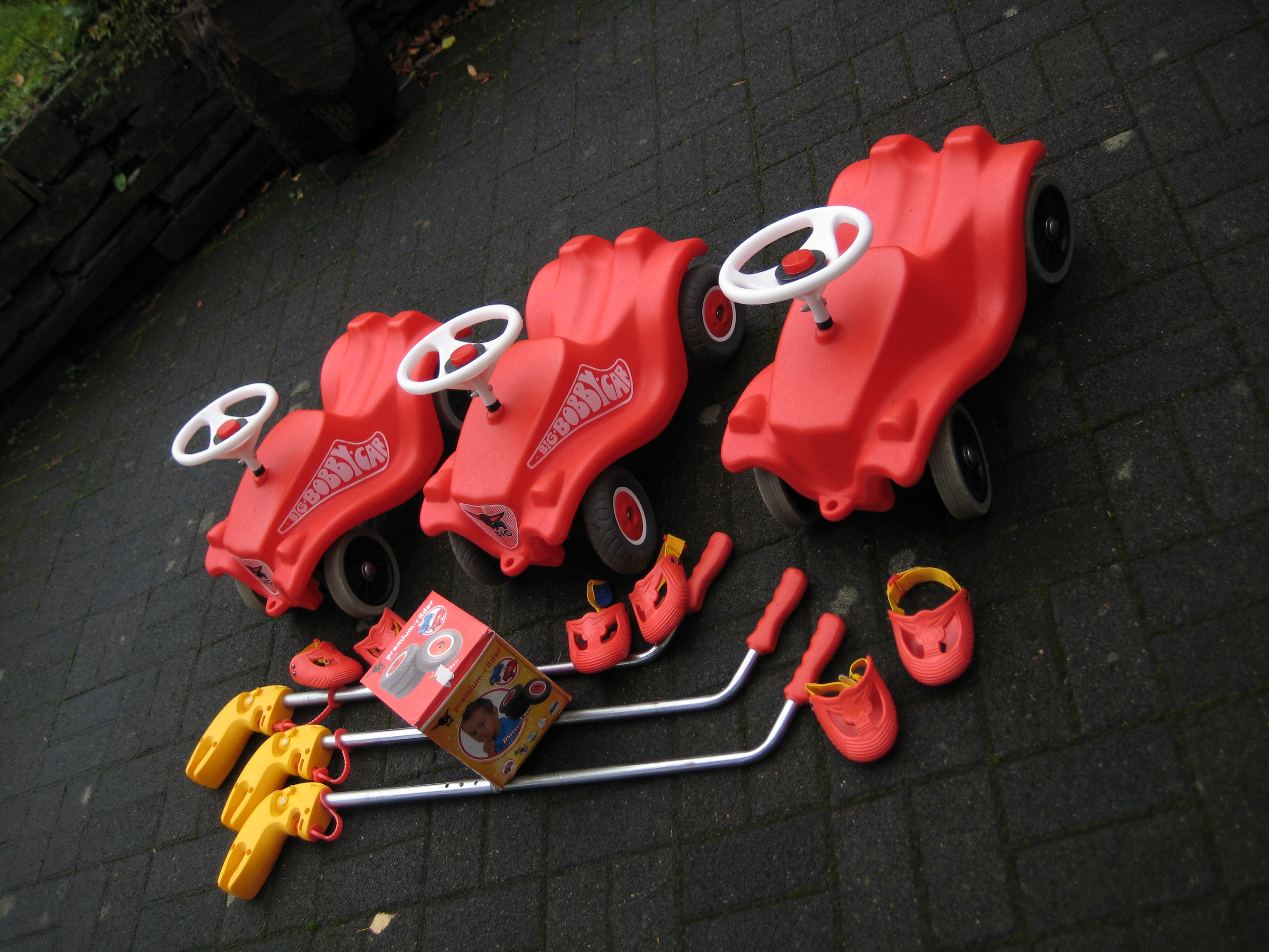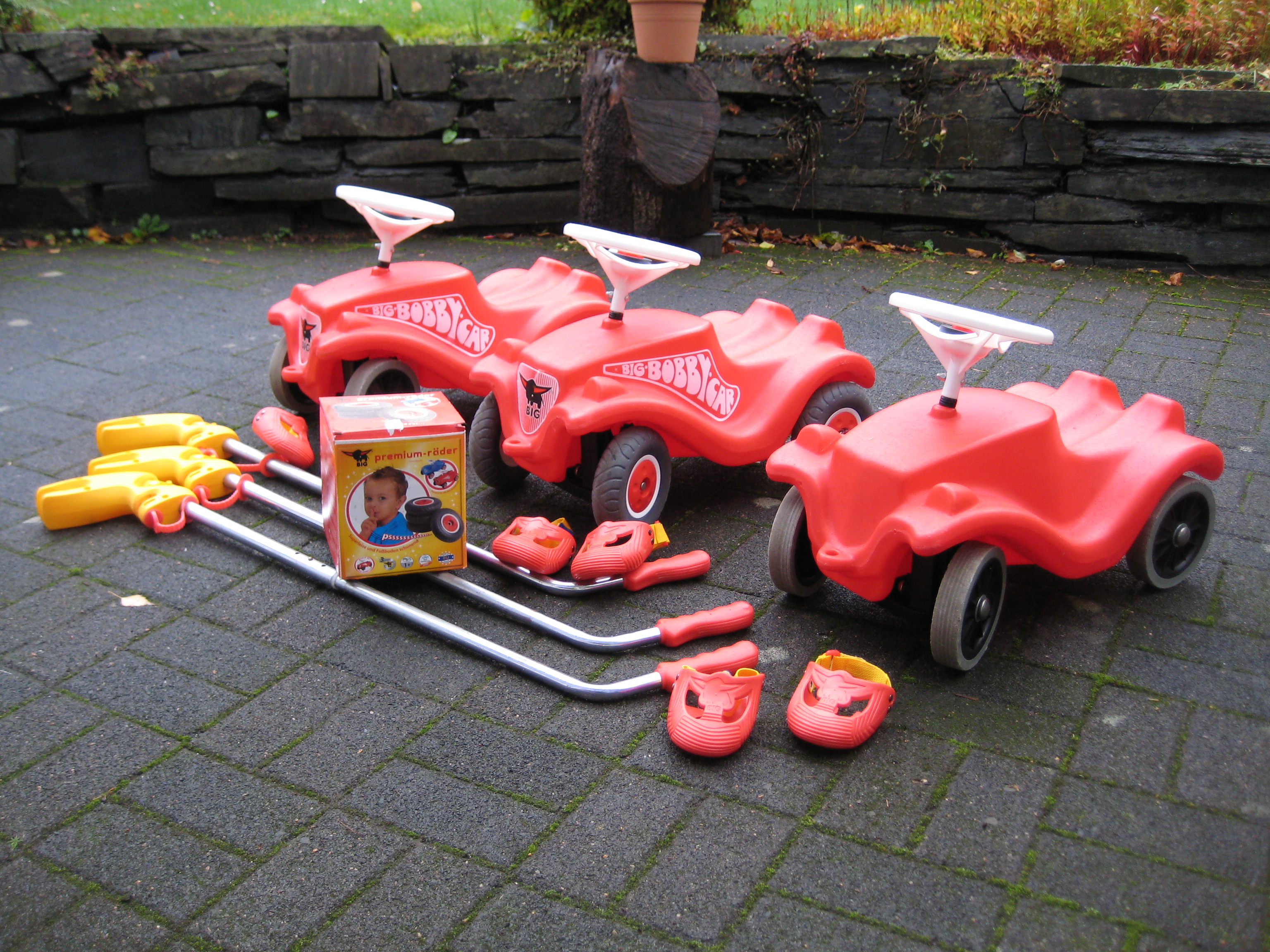 bieten hier unsere 3 Bobbycars mit Schubstangen (höhenverstellbar), Flüsterrädern und Schuhschoner an. Die Bobbycars sind in gutem gebrauchten Zustand, nur eins hat keine Beschriftung mehr. Die Schuhschoner sind neuwertig und es wird noch ein Satz Originalräder zugegeben. Die 60€ sind inkl. Versand! Diese können natürlich auch gerne abgeholt werden, dann würden wir diese für 50€ abgeben. Anrufen könnt Ihr unter Tel. 0176/78779661.